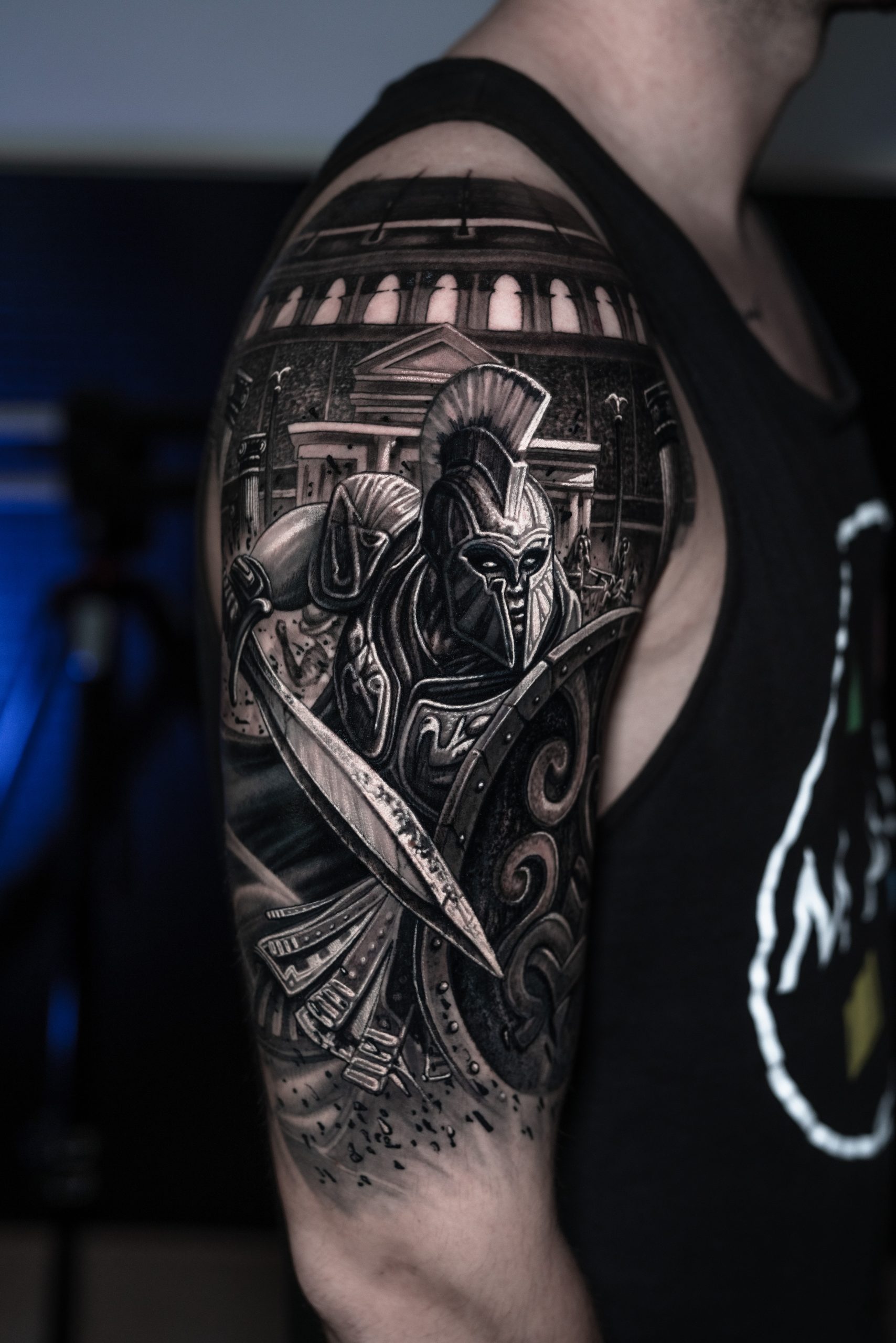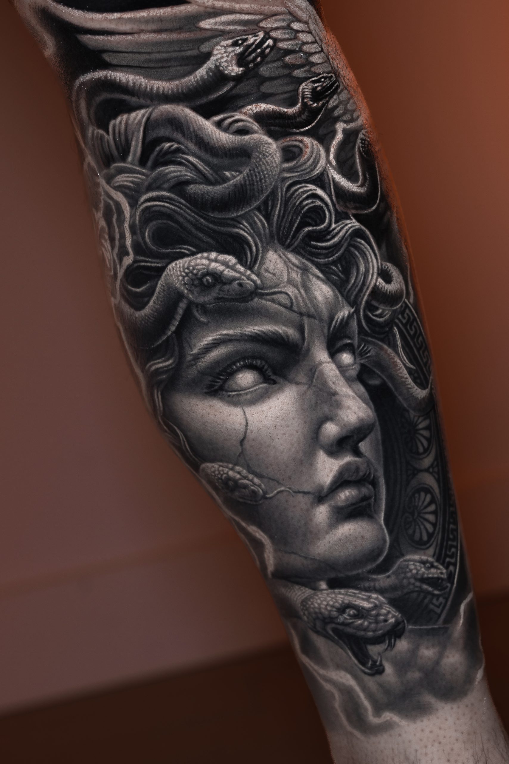 We recently completed an amazing half-leg sleeve, and now we're focused on finishing an arm sleeve. Miguel is undoubtedly one of the best black and grey realism artists around. His attention to detail and ability to bring designs to life is unmatched. His private studio offers a peaceful, relaxing atmosphere that makes each session enjoyable.