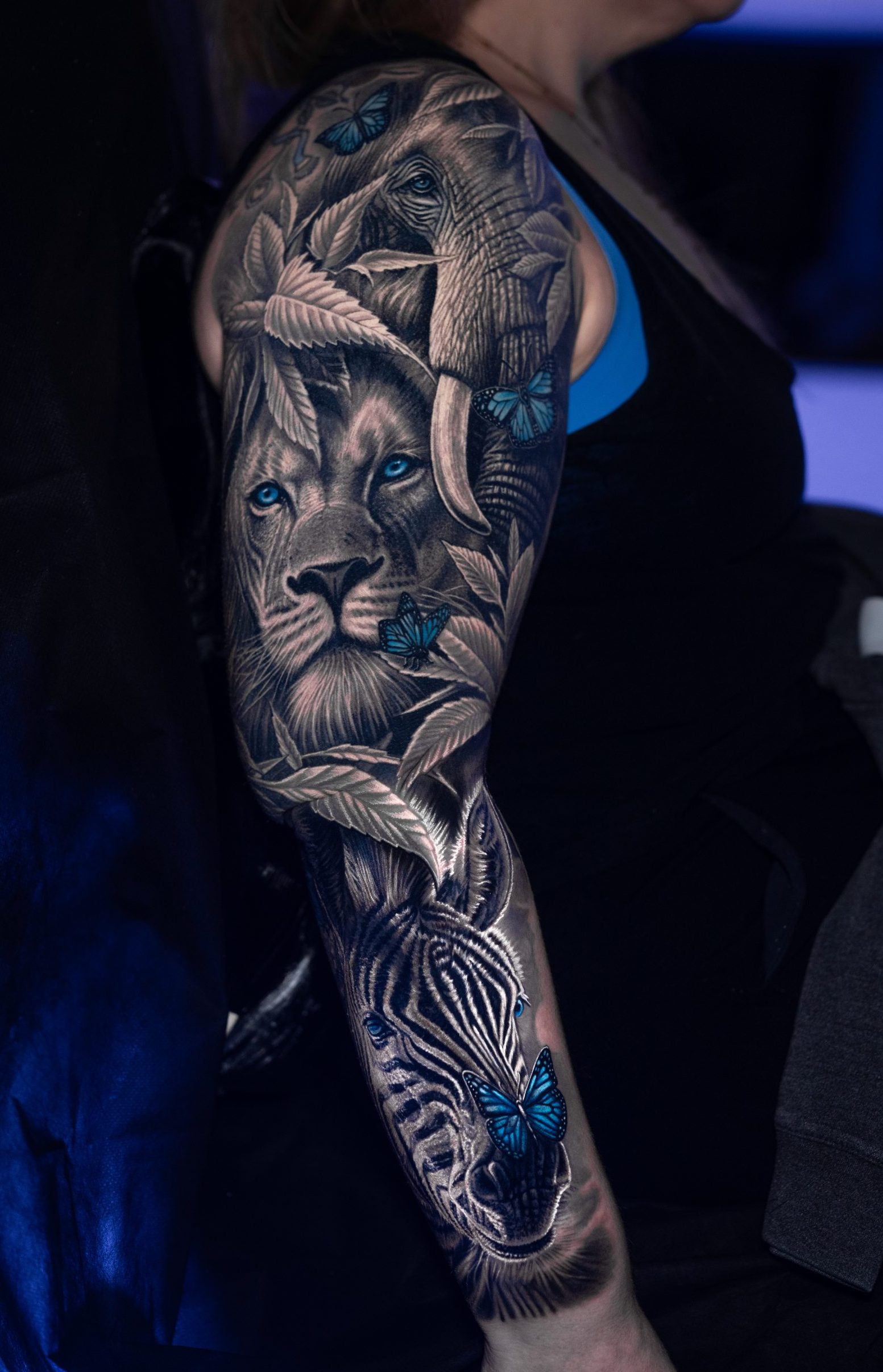 I am wrapping up a full animal safari arm sleeve with Miguel and am happy to share my experience in working with him. Miguel is a creative and collaborative artist. With this being my largest piece, I was unsure of how to approach it, but I knew from following Miguel on his socials, that I wanted to commission him to complete it. I traveled to him for all my appointments.